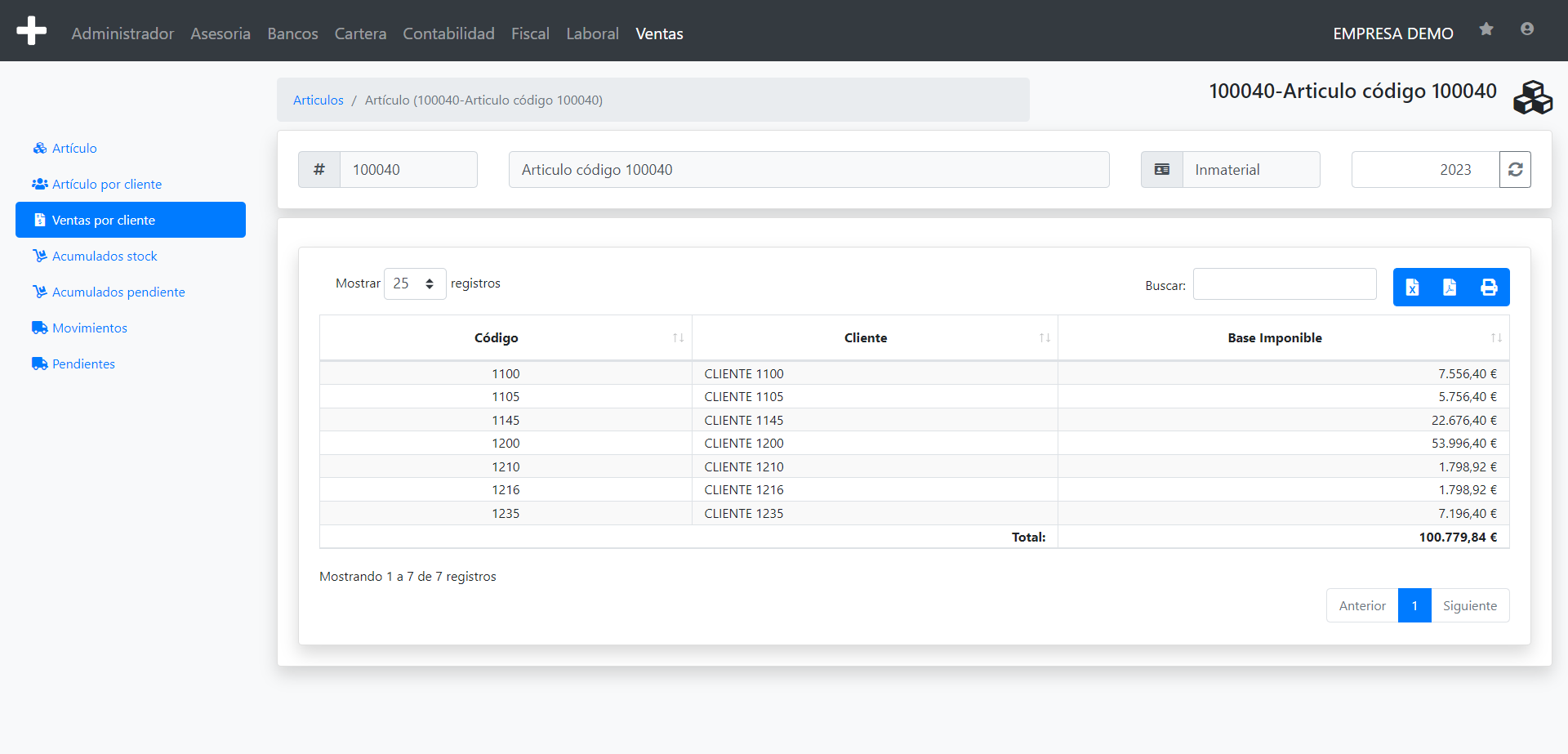 - Búsqueda de clientes (por código, nombre o Nif) y información del mismo: